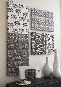 This is an old trick that still works well and can be a fun way to upcycle pretty remnants of fabric found at thrift stores, bins at fabric stores, and grandma’s sewing room. Using laundry starch is an easy method for adhering fabric to walls without permanence; when you get ready to swap it out, it comes off without much effort BUT stays in place until then. Using premade framed canvases or picture frames without glass from a hobby store can act as an even more temporary way to display fun prints, patterns, and colors. Look for cotton and other natural fibers instead of synthetics, and stick to a few colors and mix large and small patterns for the best results.